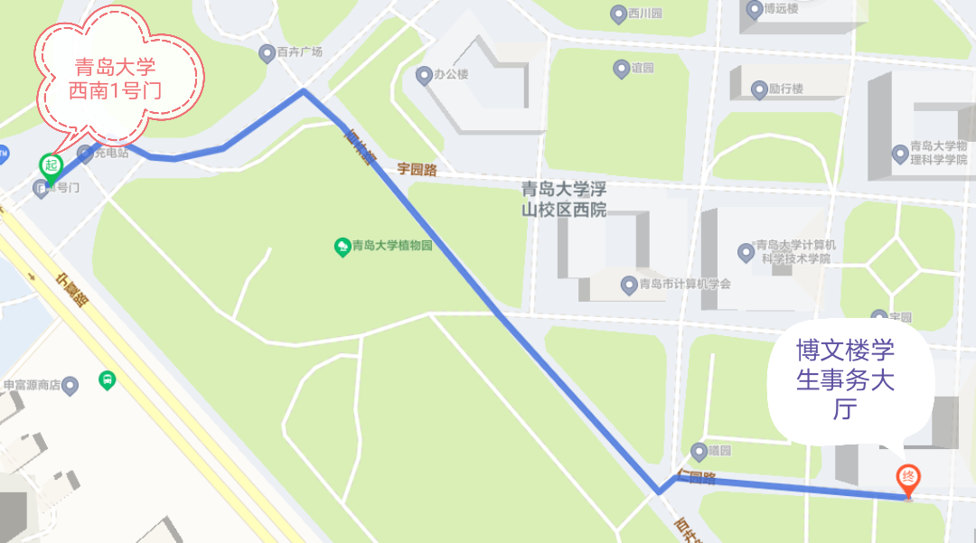 从宁夏路308号青岛大学西南1号门进入,沿蓝色指定路线走到博文楼学生事务大厅,办理报到手续后不得逗留,沿蓝色指定路线原路返回。